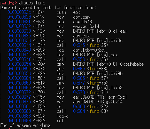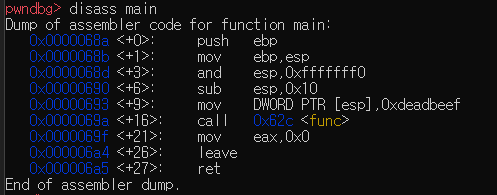 0xdeadbeef를 인자로 func함수를 호출하는 것을 볼 수 있다. 이제는 func 함수를 까보자.