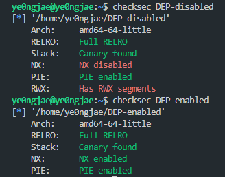 NX Bit / DEP 보호 기법이 적용된 파일 하나와 적용이 되지 않은 파일이 생성이 된 것을 확인할 수 있다.