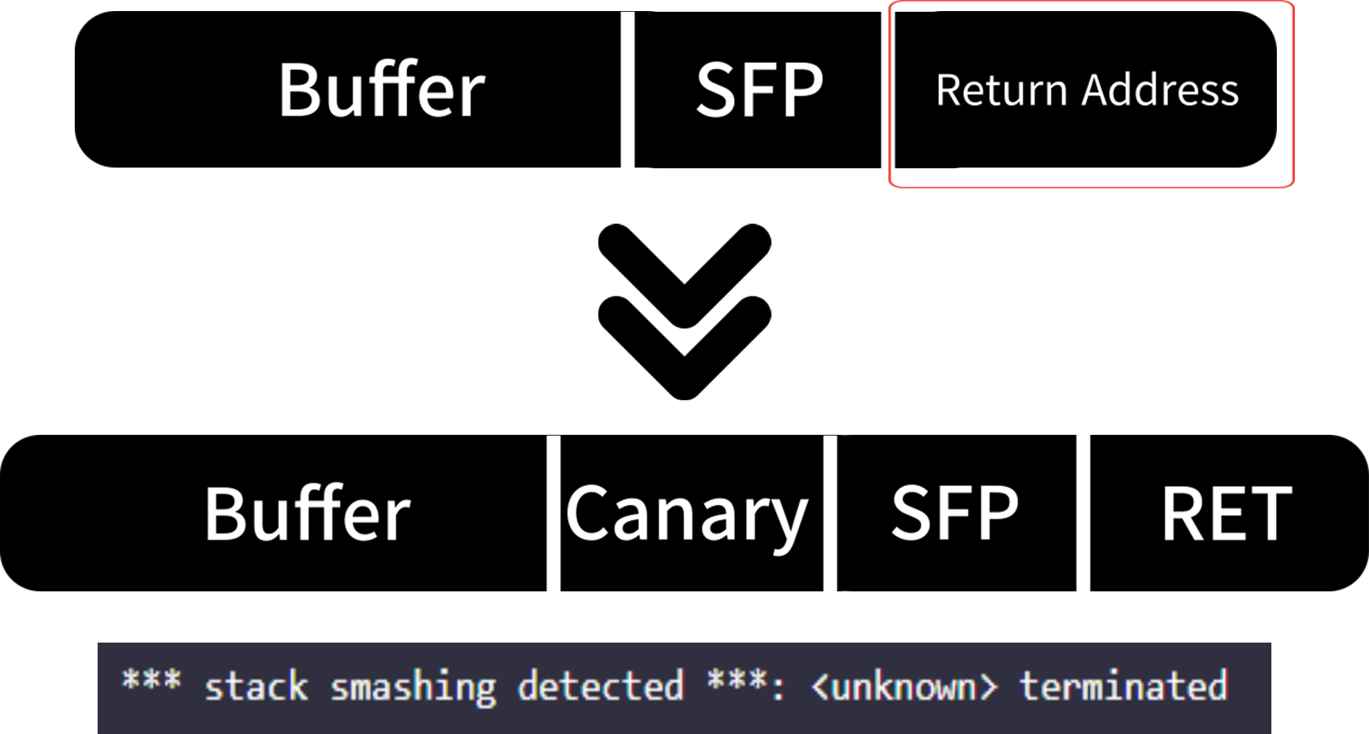 Canary 보호 기법은 sfp와 변수 사이에 공간에 특정 값을 저장하여 만일 sfp와 return address를 저장할 때 이 정보들이 공격자에 의해 덮어 씌어지는 것을 방지하기 위한 기법이다. 만일 별다른 조치 없이 BOF 공격을 진행하여 BOF가 이루어진다면 Canary 값이 변조되어 프로세스 실행이 마무리 될 때 Canary 값을 검사할 수가 없어 프로세스가 자동적으로 종료되게 된다.