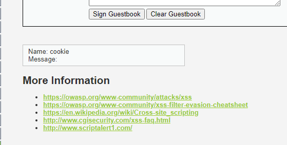 실습창에는 방명록이 구현되어 있고, 이름과 메시지를 남길 수 있게 되어있습니다. Stored XSS는 전에 설명했다시피 악성 스크립트가 포함된 게시물을 올릴 시 해당 게시물을 조회할 때 악성 스크립트가 실행되어 Stored XSS가 발생하게 됩니다.