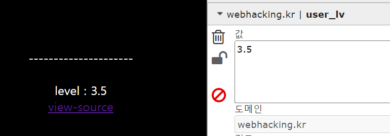view-source를 통하여 얻은 웹 페이지의 소스코드이다. 아래 php 코드를 보면 유저의 쿠키 값 중 user_lv이라는 값을 가지고 와서 만일 쿠키값이 숫자가 아니거나 user_lv 값이 4 이상이면 쿠키를 1로 지정한다. 또 아래 조건문을 살펴보면 user_lv 값이 3 초과일 경우에 문제가 풀린다고 한다.