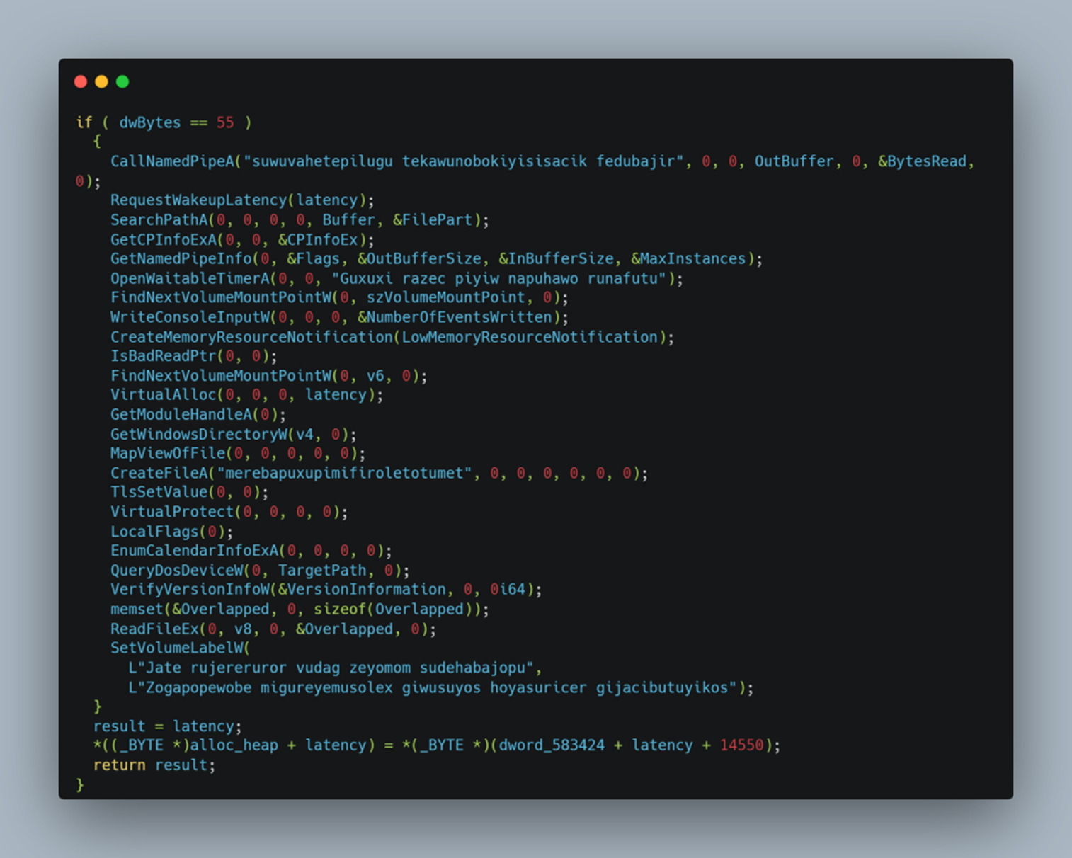sub_402EE9 내부에 존재했던 sub_402B88 함수를 보면 처음에 SetDefaultCommConfigW로 통신 프로그램을 구성하고 있는데, 이를 통해 공격자에게 무언가를 보낼 거란 걸 추측할 수 있고, 이는 sub_402C34 함수에서 얻었던 컴퓨터 정보일 확률이 높다. 이런 일련의 과정이 끝나면, 다시 sub_402EE9로 돌아와 드라이브 정보, 파일 위치, 정보 등을 수정하고 스레드를 종료한다.