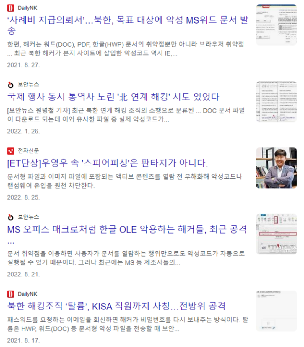 문서형 악성코드의 경우 북한의 해커들이 미국, 한국 등의 북한 관련 인물, 군사·과학 연구 관련 분야 종사자들을 대상으로 지속해서 공격해오고 있고, 최근 들어 점점 증가하고 있다.