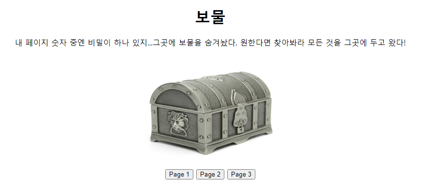 보물상자 이미지와 함께 " 내 페이지 숫자 중엔 비밀이 하나 있지... 그곳에 보물을 숨겨놨다. 원한다면 찾아봐라 모든 것을 그곳에 두고 왔다!" 라는 글이 적혀 있다. 아무래도 Page 중 특정 숫자의 페이지에 Flag 값이 숨겨져 있는 것 같았다.