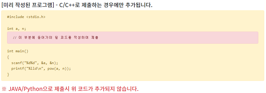 단, 함수형 문제이므로 함수 pow()만 작성하여 제출하시오.