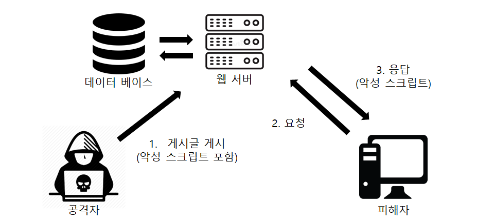 Reflected XSS와 달리 Stored XSS는 공격자가 악성 스크립트가 포함된 게시글을 게시판 같은 곳에 게시한 후 피해자가 이 게시글을 조회하면서 발생하는 XSS입니다. 즉, 피해자가 공격자의 악성 스크립트가 포함된 게시글을 조회하면 악성 스크립트가 실행되면서 피해자는 공격자의 악성 스크립트에 따라 피해를 받게 됩니다.