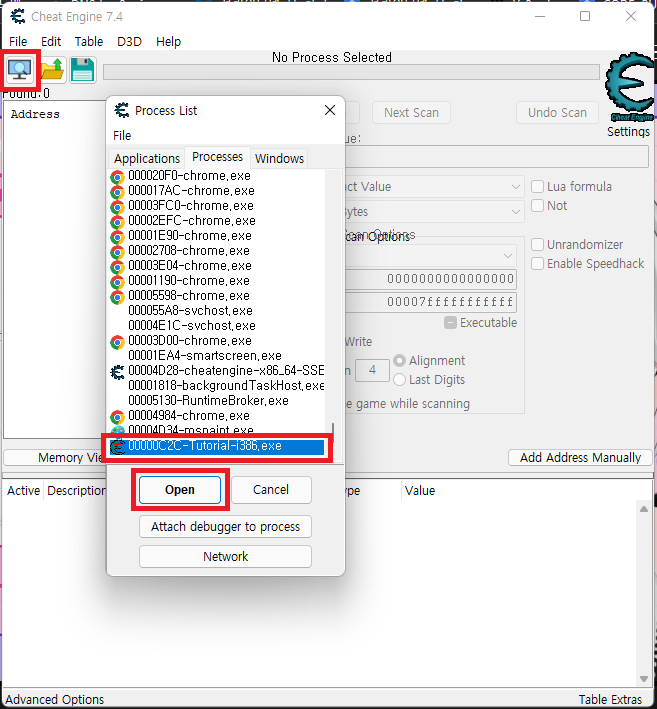 Cheat Engine Tutorial Process를 찾아 열어준다.