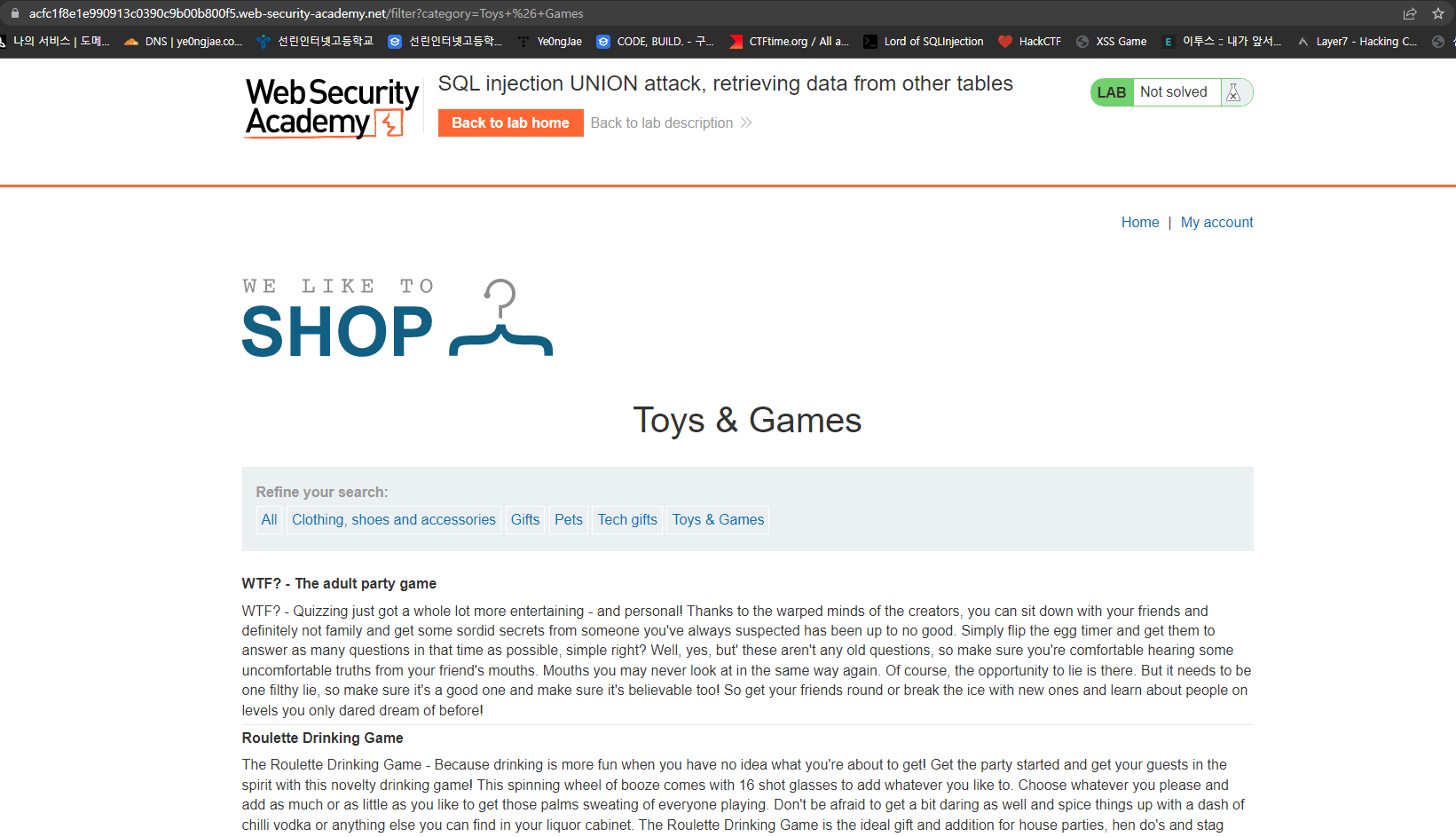문제에 접속하면 게시글들이 있는데 위에 카테고리 정렬 기능을 통해 UNION SQL Injection을 일으킬 수 있을 것으로 보인다. 우선 카테고리를 선택 한 다음 파라미터가 어떻게 되는지 알아보았다.