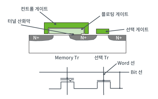 앞서 설명한 EPROM과 같이 데이터 수정이 가능한 ROM입니다. 하지만 EPROM과는 다르게 전류를 이용하여 데이터의 기록, 수정 및 삭제를 진행합니다. EPROM과 큰 틀은 같지만, 원리는 조금 다릅니다. EEPROM에는 선택 게이트, 컨트롤 게이트 등 여러가지 게이트가 존재합니다.
