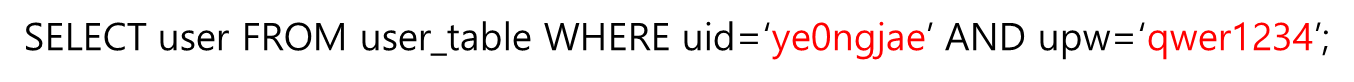 공격자는 uid 입력 칸에 '를 입력하여 upw=' '로 만들고 뒤에 OR '1' = '1'을 붙였습니다. WHERE 구문 뒤에 오는 부분을 보면 false AND false OR true로 정리할 수 있습니다. WHERE 구문 뒤에 붙언 OR 로 인해 해당 구문의 연산 값은 true가 되어 올바른 값으로 판단하고 실행하게 됩니다. 따라서 로그인에 성공하게 됩니다.