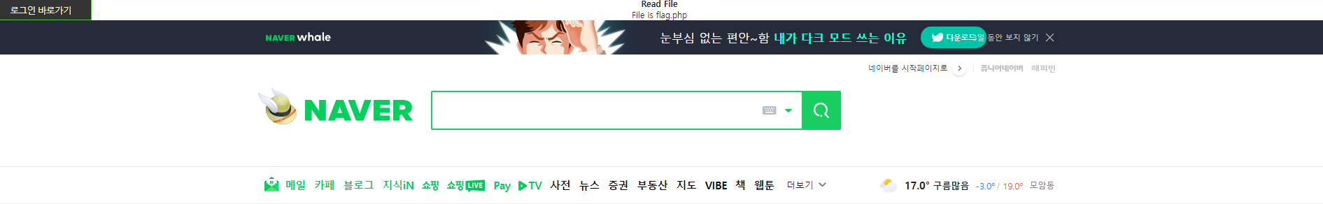 네이버 페이지가 나오는 것을 확인할 수 있었습니다. 이번에는 flag.php에 접근하기 위하여 command 뒤에 flag.php를 해보았습니다.