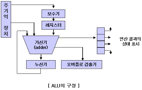 산술연산, 논리 연산 등의 연산을 수행하는 CPU 속 부품입니다. ALU는 가산기와 누산기, 보수기 등으로 이루어져 있습니다.